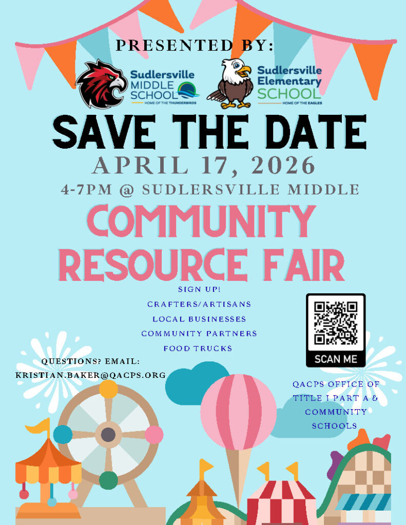 Come join us for a fun and informative afternoon at the Community Resource Fair presented by Sudlersville Middle and Elementary School! Spend some time connecting with community partners, visiting the local crafters and artisans, talking with local businesses, and getting a bite to eat from one of the visiting food trucks. See the flyer below for more information!